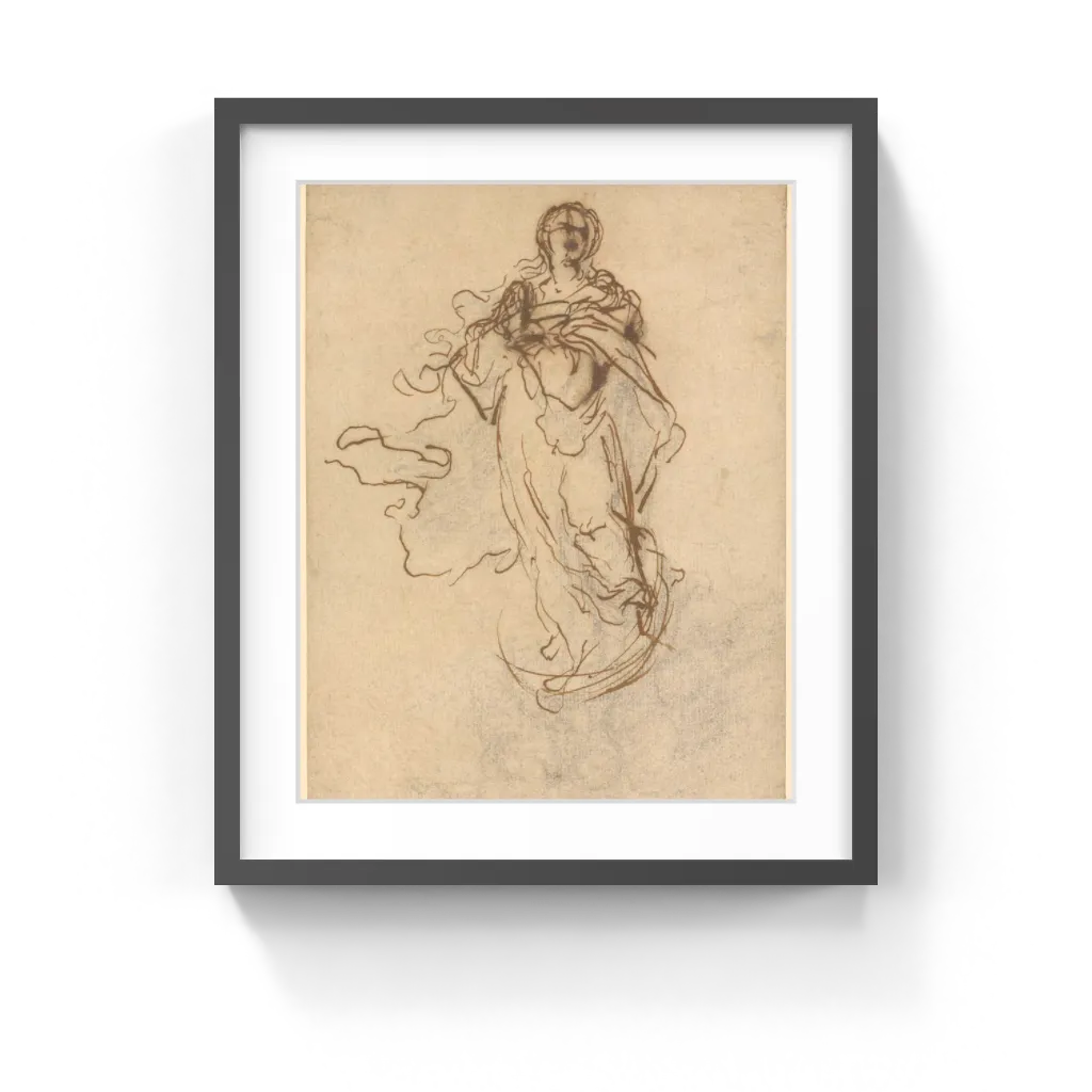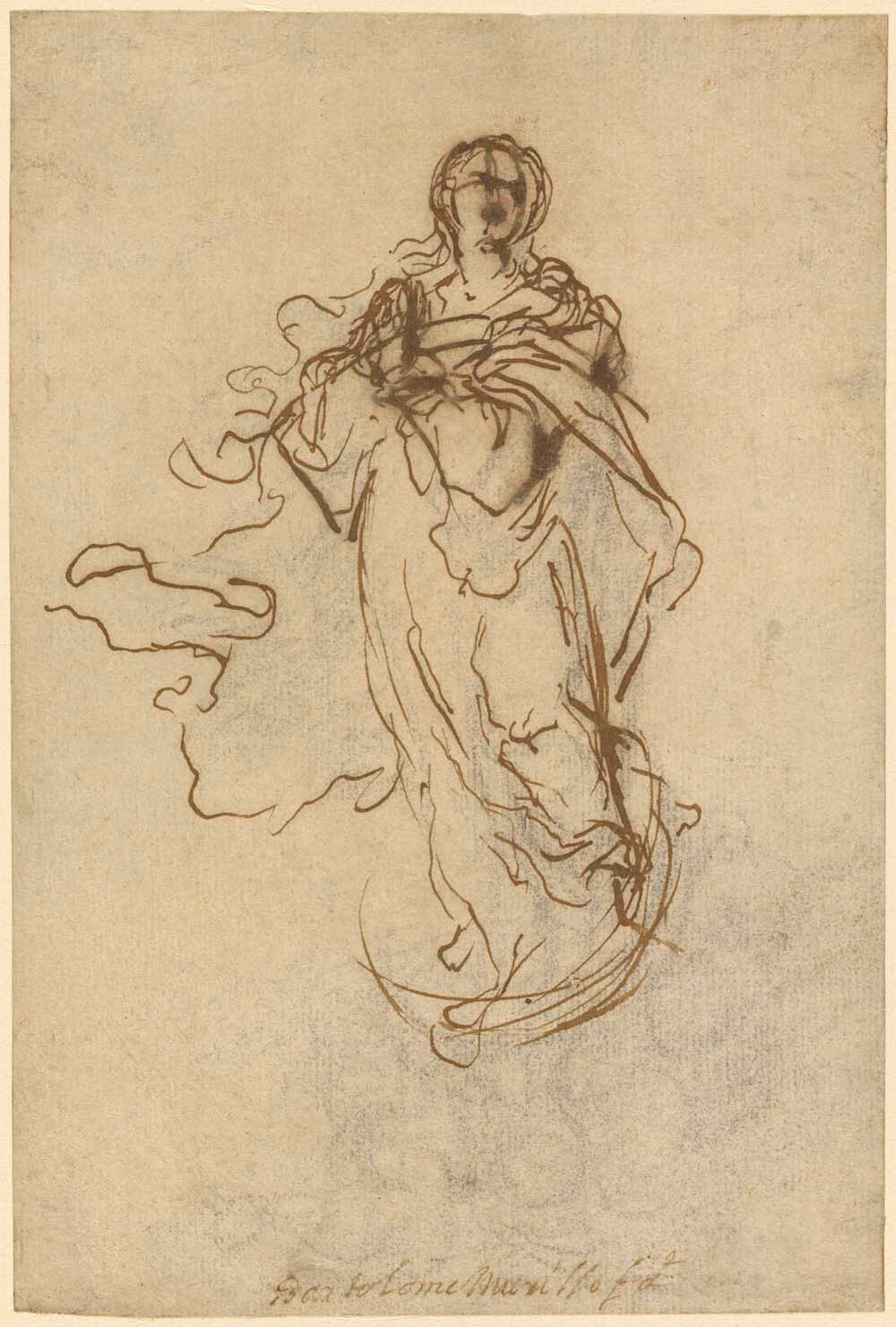Bartolomé Esteban Murillo (Spanish, 1617–1682) Bartolomé Esteban Murillo pictured the Virgin Mary standing in the heavens upon a crescent moon, with her hands folded and loose squiggles of hair and cloak billowing to the left. To create the image, he first drew in black chalk, then rapidly drew the principal contours in pen and ink. Barely discernible are the faint chalk indications of the cloud studded with putti heads on which the Virgin stands, which Murillo did not reinforce, suggesting that he abandoned the sketch before completion.