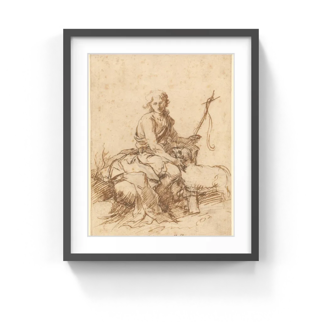Bartolomé Esteban Murrillo communicated the same message here through John's direct visual engagement of the viewer's attention. Executed in Murillo's early pen style, the drawing displays his distinctive use of chiaroscuro and structured hatching.