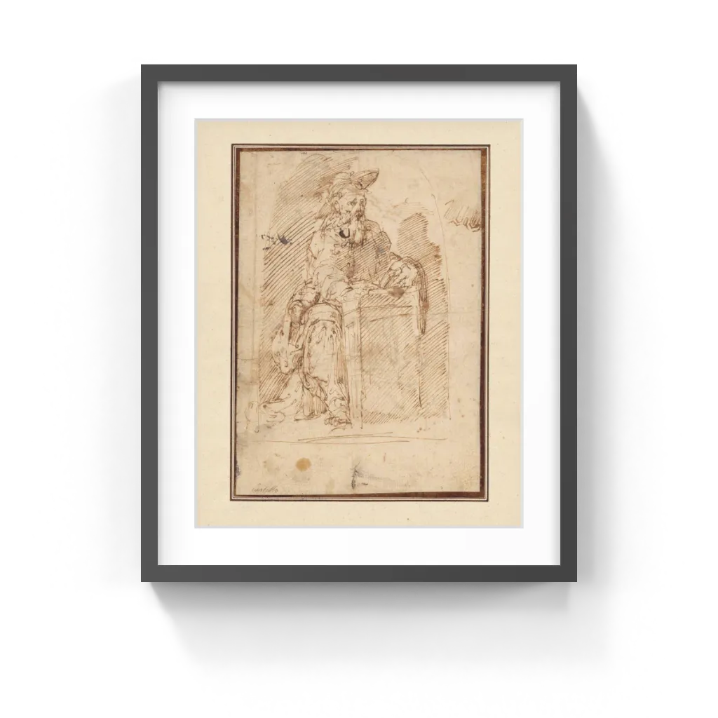 Attributed to Juan del Castillo (Spanish, about 1590–about 1657) Saint Jerome sits at a small pedestal desk within a niche, apparently writing in a book that he supports with his left hand. Casting a deep shadow over the right side of Jerome's body and the back of the niche, the hatching hints at the depth of the shallow space. Although by the mid-1600s this depiction was considered a little old-fashioned, artists in the Renaissance frequently showed the intellectual saint at work in his study.