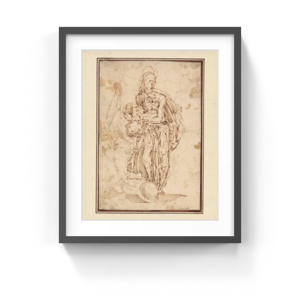 Attributed to Juan del Castillo (Spanish, about 1590–about 1657) This figure, labeled Amititia (Amicitia) in the lower left, represents Friendship. Juan del Castillo took the elements of the allegory from Cesare Ripa's Iconologia of the 1600s, which became a standard reference work for artists searching for ways to represent abstract ideas. According to Ripa, Amicitia was to be shown as a fair young woman, simply draped in the white robe of Truth, the virtue upon which friendship is based. She goes barefoot "for friendship knows no inconvenience too great for it," and rests one foot on a skull, "for friendship jeers at death." The artist probably intended the sphere drawn here as a free allusion to the skull. The inscription cerca (close) and lexos (far) on her breast refers to Ripa's description of keeping friends close to one's heart, regardless of whether they are near or far.