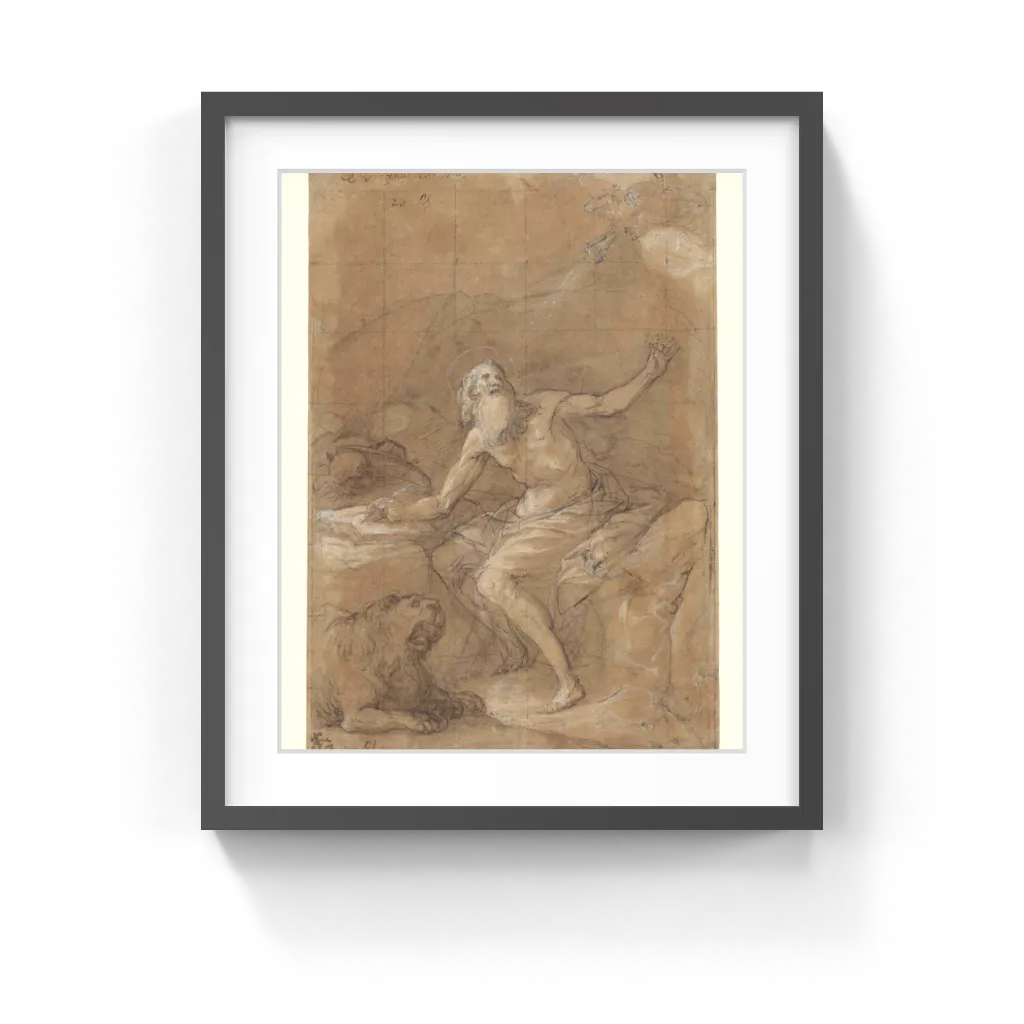 Artists often showed Jerome writing, undoubtedly a common activity for the learned saint who translated the Bible into Latin. Jerome commonly appeared nearly nude, giving artists the opportunity to display his gaunt, ascetic figure. Carducho suggested the saint's lean, muscular body with brown wash and white gouache, using while radiating strokes of black chalk to describe the drapery, which nearly merges with the rocks. The artist reworked the saint's right leg several times, positioning it first forward and then further back until it rested underneath his left knee. The black chalk squaring on this drawing implies that Carducho intended this drawing as a preparatory study for a large painting, although scholars have not identified such a work.
