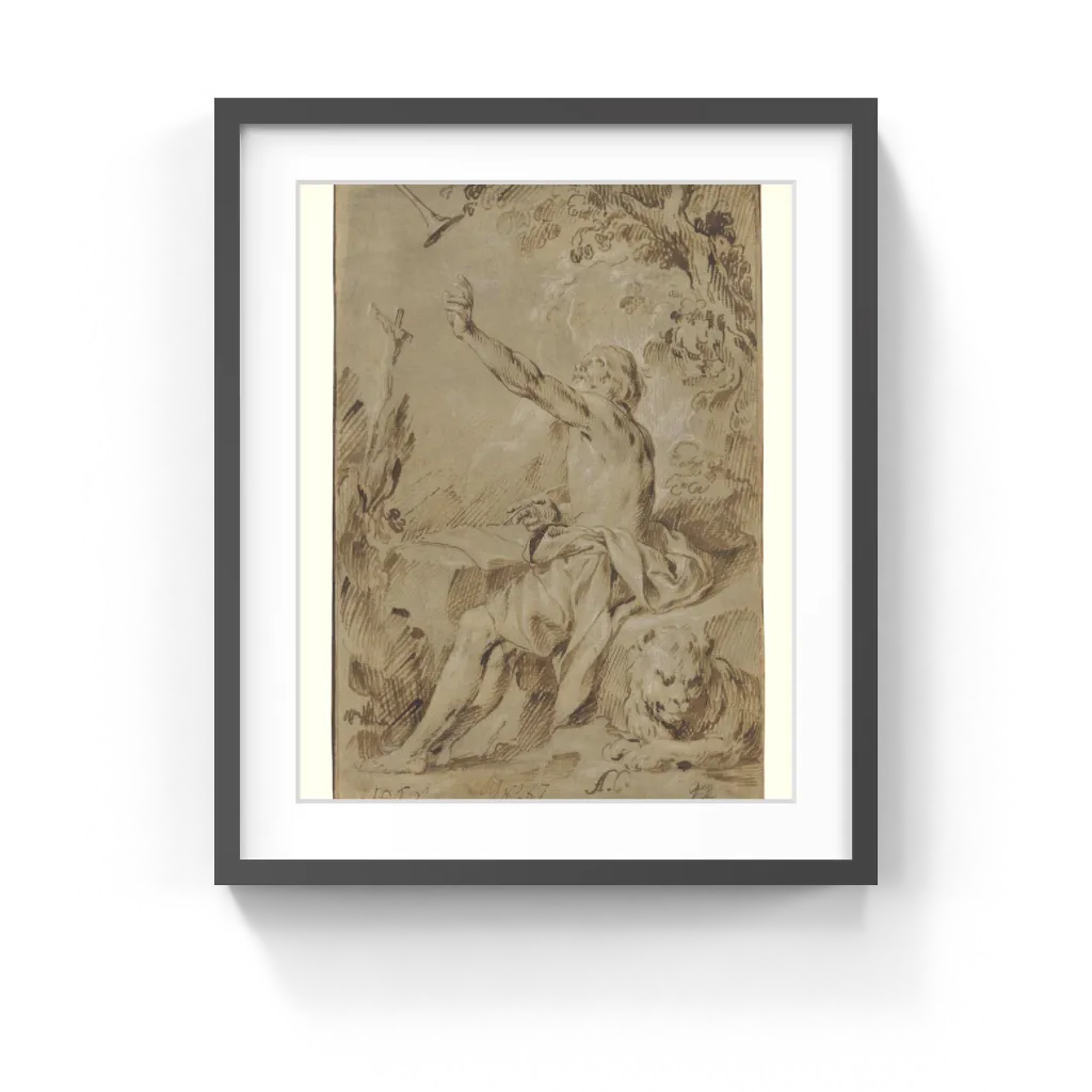 Saint Jerome heard trumpets sounding the Last Judgment; looking up, he saw the cross with Christ's body rising in front of him. Here the trumpet appears so tantalizingly close that Jerome reaches up to try to touch it. His attributes, a lion and a book, surround him.