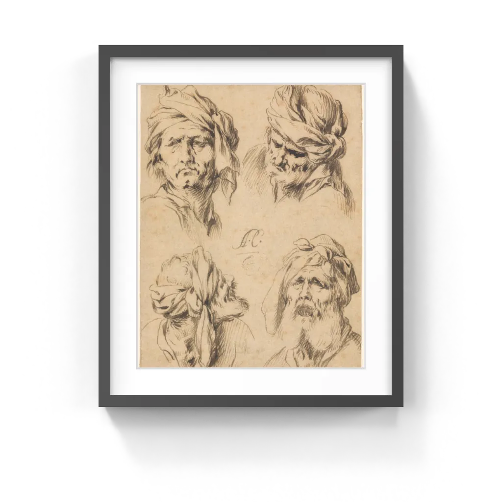 Antonio Castillo y Saavedra (Spanish, 1616–1668) These four heads display a range of facial expressions and positions. The dignified gaze of the head at upper left contrasts with the more introverted, downward look of its counterpart on the upper right. The profile at the lower left acts as a foil to the opposite face emitting an agonized cry. Antonio del Castillo y Saavedra varied the way each scarf was tied about the hair to reflect the wearer's range of emotion. The sheet may have come from a book of instructional models for drawing. For centuries, European artists had created such modelbooks as patterns to be copied by apprentices and workshop assistants.