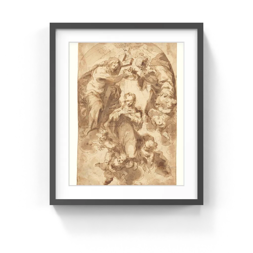 Francisco Ribalta (Spanish, 1565–1628) Tumbling angels support the Virgin Mary as she graciously accepts the crown as Queen of Heaven. During the mid-1660s, the Coronation of the Virgin was a very popular subject in Catholic circles, especially in Spain. Francisco Ribalta treated the theme with remarkable dynamism and originality. He applied wash to strengthen the vigorous pen work and to unite the composition. The arched upper section suggests that he made the drawing in preparation for an altar painting.