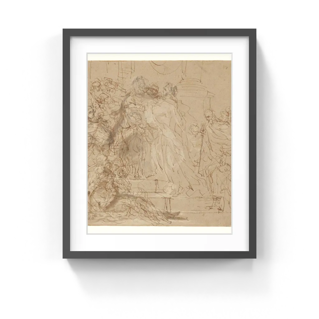 Juan Carreño de Miranda conveyed the scene thorough energetic motion and nervous handling of the pen. Vigorous strokes describe the flowing outline of the Virgin's cloak, while summary passages of wash in gray-brown define Elizabeth's head and back. Amid the swirling mass of lines on the left several indistinct heads are visible. Another mother crouches at the foot of the steps, holding a baby in her arms.