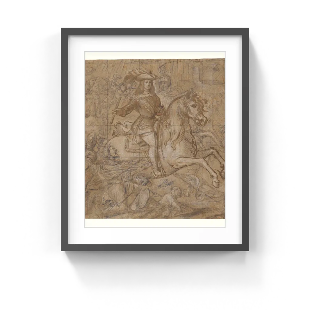 José Ximénez Donoso copied the equestrian figure from a well-known etching by Jusepe de Ribera but added soldiers and spectators to the background. The artist drew the whole scene in black chalk but reinforced the forms of Don José and his horse, copied from the print, in pen and brown ink. The drawing is squared for transfer, implying that the composition was intended for a painting or perhaps a print.