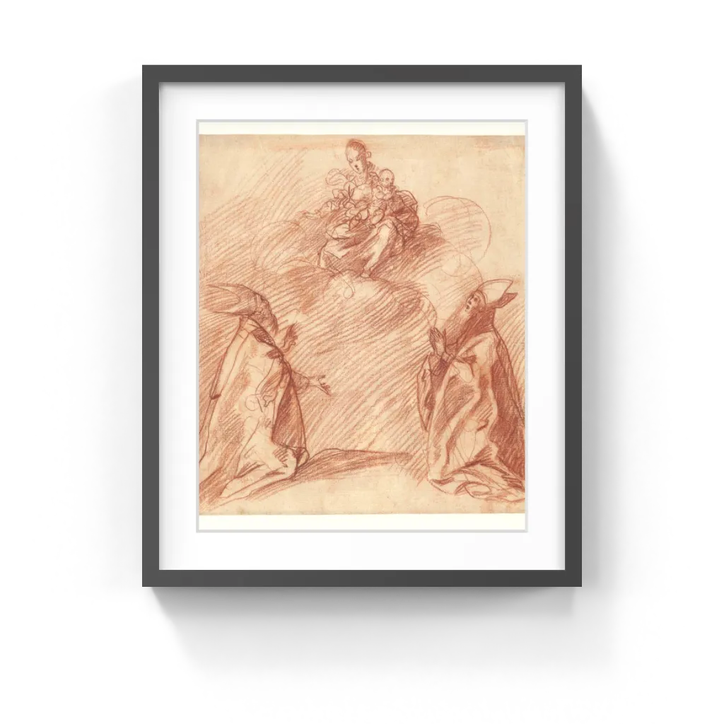 The red chalk is applied energetically, loosely outlining the form of the Virgin and Child with strong, swirling strokes. Broad diagonal lines create the billowing clouds that support the Virgin and Child and give the scene immediacy and vigor. Similarly, strong outlines and diagonal hatching create volume on the cloaks of the two bishops.
