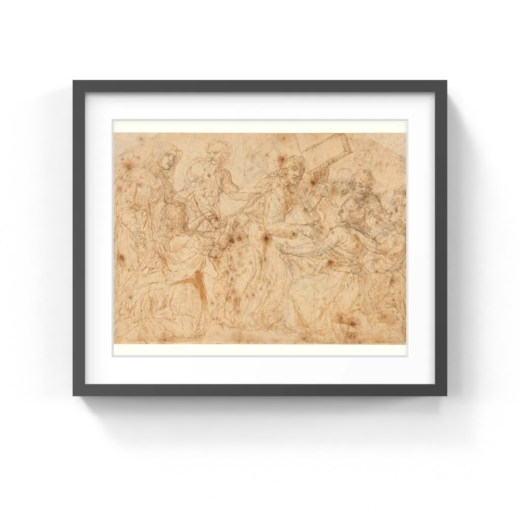 Christ farther to the left, carrying the cross with his right arm. The soldier to the right, leading him by the rope about his neck, was also father to the left, while two additional soldiers, faintly drawn in the top right, were not developed in pen. The Holy Women kneeling before him also changed when Juanes finished the drawing in pen after making the chalk underdrawing. He used the brown ink to model the forms in three dimensions with extensive, insistent hatching and cross-hatching. The artist's technique and the spatial clarity of the individual figures reflect the influence of Raphael, whose paintings he studied on a visit to Italy around 1560.