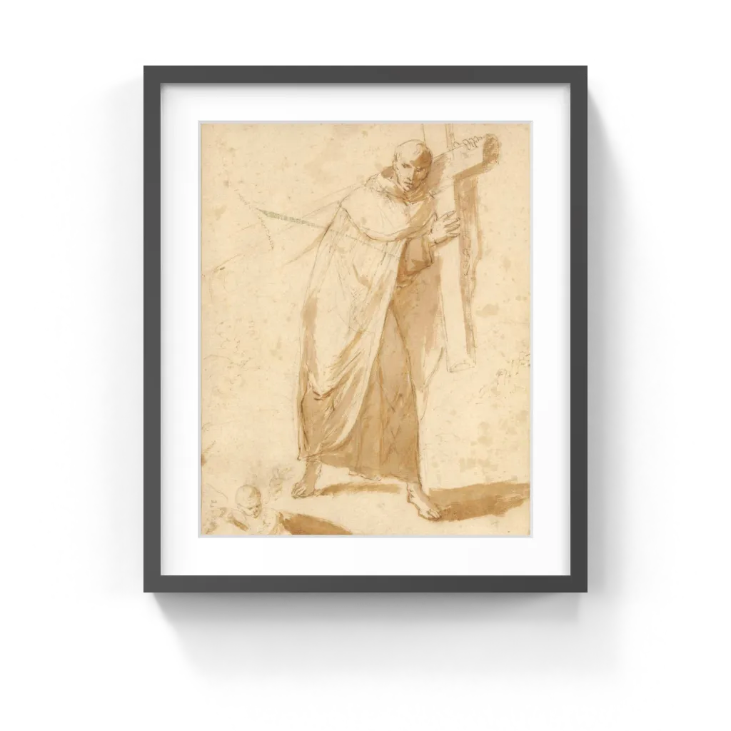 Follower of Bartolomé Esteban Murillo (Spanish, 1617–1682) With light, delicate strokes, the artist created a scene of almost geometric simplification. Using spare contours and pale washes, he created the long cloak that covers the body of the monk; his small, round head; and the straight lines of the cross. Faint shadows extend out from either foot, as well as from the small winged putto holding an empty escutcheon in the left corner, giving both figures an impression of depth.