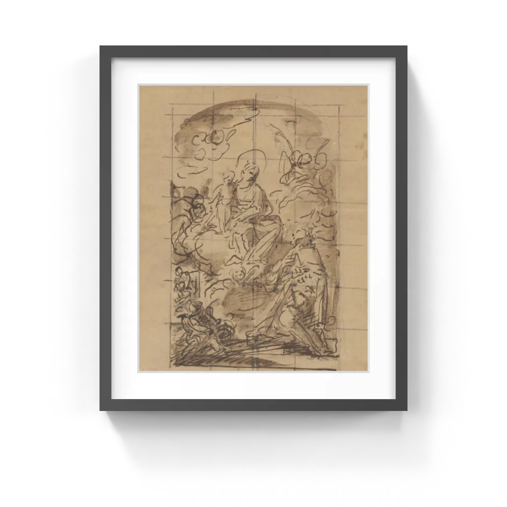 Mariano Salvador Maella (Spanish, 1739–1819) Saint Fernando gazes upward, paying homage to a vision of the Virgin Mary and Christ Child floating on a pillow of clouds surrounded by winged putti. The arched top and the squaring suggest that the artist planned a painted altarpiece.