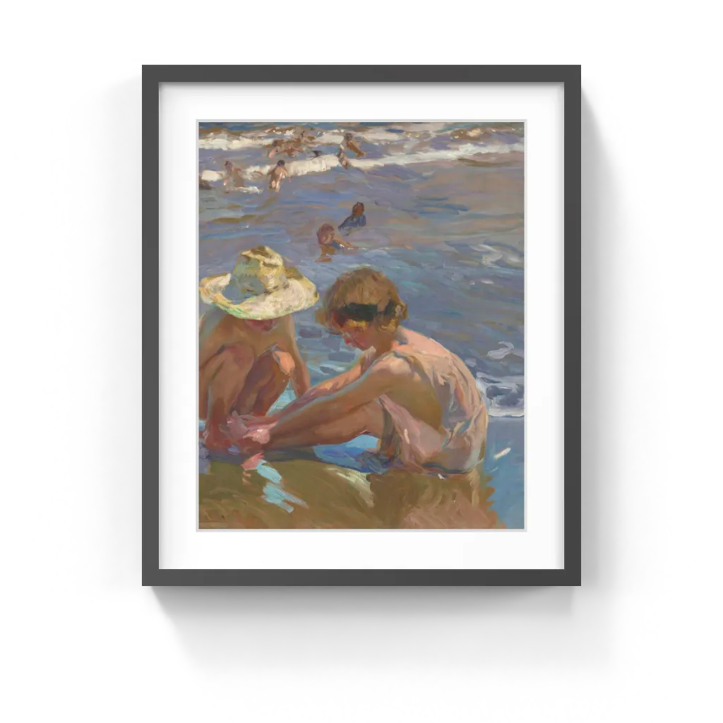 While on the beach at Valencia,Joaquín Sorolla y Bastida rapidly painted a group of pictures including The Wounded Foot. Like the Impressionists before him, Sorolla worked outdoors to capture the momentary effects of light, water, and people in motion. This painting's casual snapshot-like cropping, which cuts off the arm of the child at the left, gives the viewer the same sense of immediacy, as if he or she has accidentally happened upon an impromptu exchange between two children on the sand.