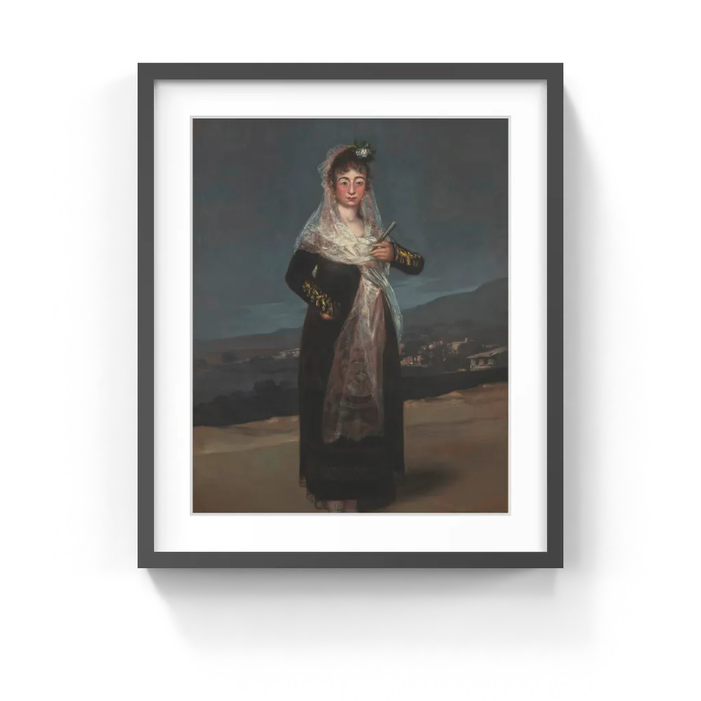 Francisco José de Goya y Lucientes (Francisco de Goya) (Spanish, 1746–1828) The Marquesa de Santiago stands full-length in front of a landscape of gently sloping hills. Well-born, very wealthy, and a commanding presence, she confronts the viewer directly. Her white lace mantilla extends to her knees, and she holds a closed fan in her left hand. Heavily applied make-up accentuates her features. Known for her dissolute lifestyle, the Marquesa died at the age of forty-three, three years after this portrait was made. An English visitor to Spain once described her as "very profligate and loose in her manners and conversations, and scarcely admitted into female society… and said to boast of her nocturnal revels."