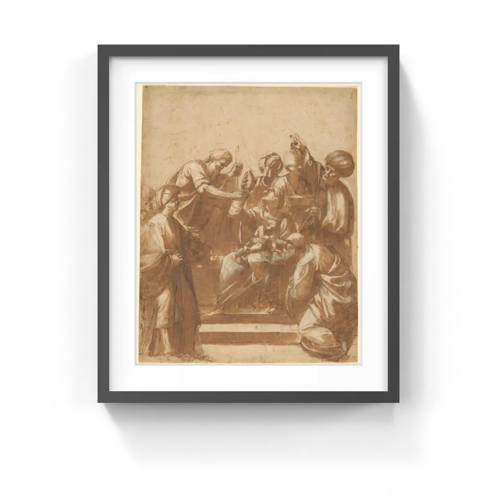 Attributed to Jusepe de Ribera (Spanish/ Italian, 1591–1652) Jusepe de Ribera chose an unusual arrangement for his powerful composition of a frequently depicted subject. The Magi, wise men from the East, and their attendants crowd into a small space around the Virgin Mary and the newborn Christ Child. As the wise man on the right kneels down humbly to pay his respects, however, the one on the left seems to stand apart grimacing. Another, at the back of the scene, impolitely turns away completely, showing only the back of his head to the Mother and Child. Joseph has already taken one of the gifts, offering it to his wife, who grabs it eagerly.