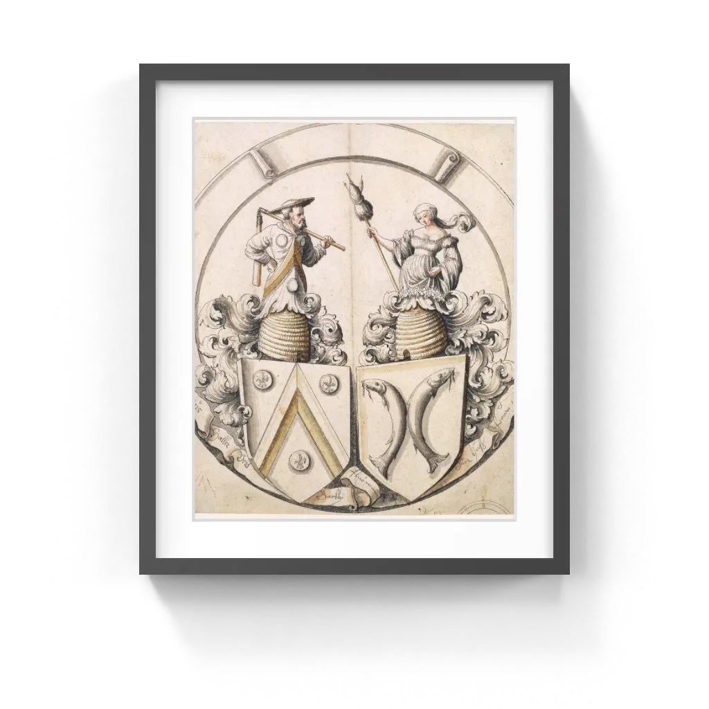 Hieronymus Lang (Swiss, active 1541–1582) This design for a circular stained-glass window commemorates the marriage between Bitzius Haller and Barbara Fluomann, members of prominent Swiss families from Bern. An inscription around the base of the roundel details the commission, while an empty scroll at the top provides room for other lettering. On the left side, above one coat of arms, a beehive supports the figure of a man covered with the family emblems and carrying a flail. The female figure on the right rests on another beehive above her coat of arms; she carries a distaff, a tool used for spinning. To produce a stained-glass window, patrons commissioned an artist to make a cartoon for the design. Once the patrons had approved this image, another specialist craftsman cut the glass in shapes and colors according to the design or painted the scene directly onto a colorless glass panel.