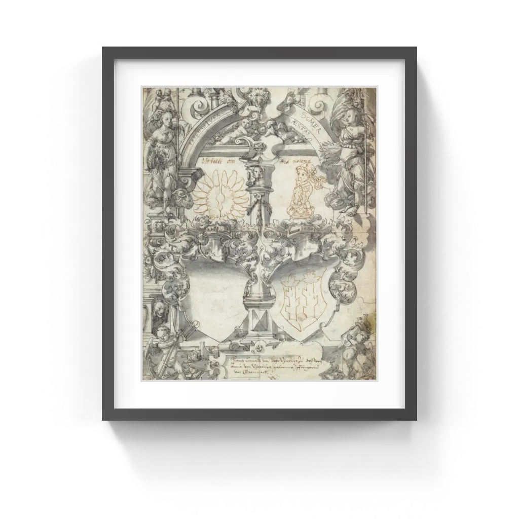 cartoon for a glass painter to copy; it was never intended for the patrons to see. He left empty spaces for the coats of arms and only lightly sketched them in later in brown ink. He also left various areas incomplete on the right side when they mirrored the symmetrical elements on the left. Notations in black chalk throughout the design give color instructions.