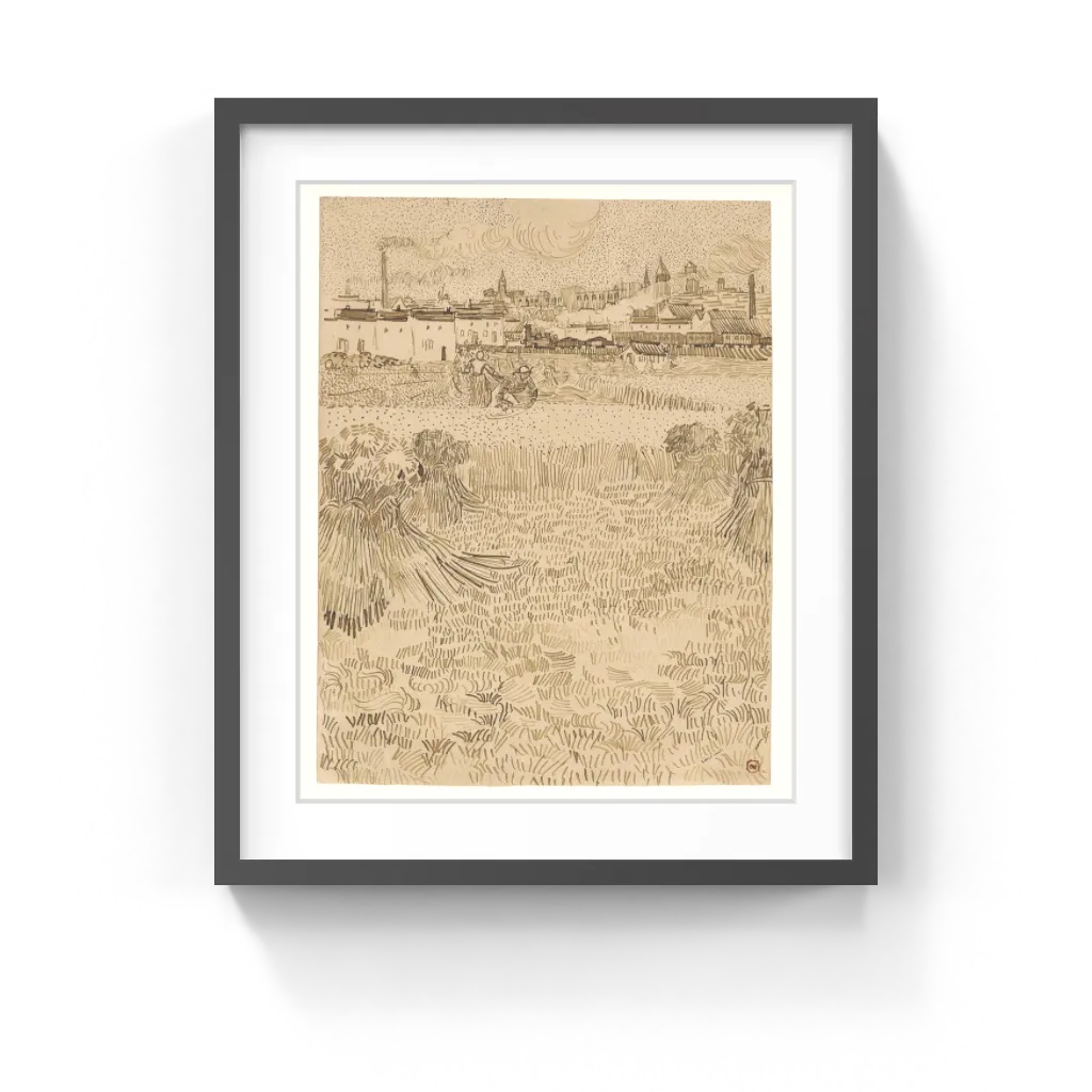 Vincent van Gogh (Dutch, 1853–1890) Vincent van Gogh made this drawing in varied hues of golden brown ink as a study of a painting. The vertical composition, whereby forms grow smaller and denser as the eye moves up, leads the eye across the stubble of a newly cut wheat field framed by gathered stacks of wheat. In the center, a man scythes a section of the field while a woman bundles cut wheat under her arm. The background shifts to the cityscape of Arles, where churches and densely packed houses stretch across the horizon. A railroad train and factories churning smoke into the sky signal the dawn of the machine world and its effect on traditional ways of life.