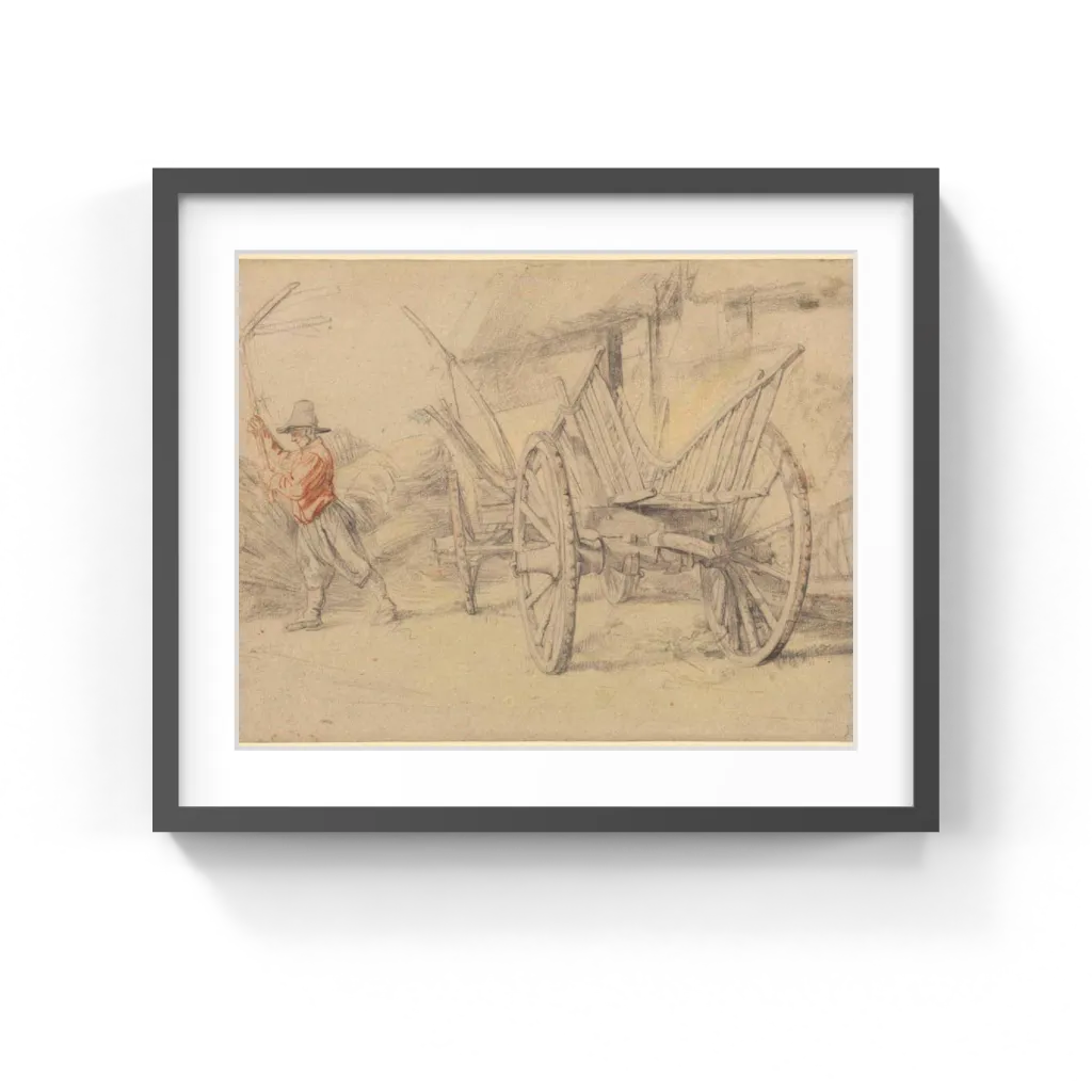 Peter Paul Rubens (Flemish, 1577–1640) While this wagon recurs in several paintings, Peter Paul Rubens may have intended this drawing as an independent work of art, rather than a study. Although its composition is simple, this humble genre scene displays Rubens's characteristic lively technique. The sharp perspective, unusual rear view, and lack of alignment between front and rear axles draw the viewer into the space. The splayed side rails and wheel spokes all thrust outward in repeating lines, charging the stationary wagon with energy. Rubens's experiments with different positions for the rustic wagon and the farmer's flail further increase the effect of motion and symmetry.