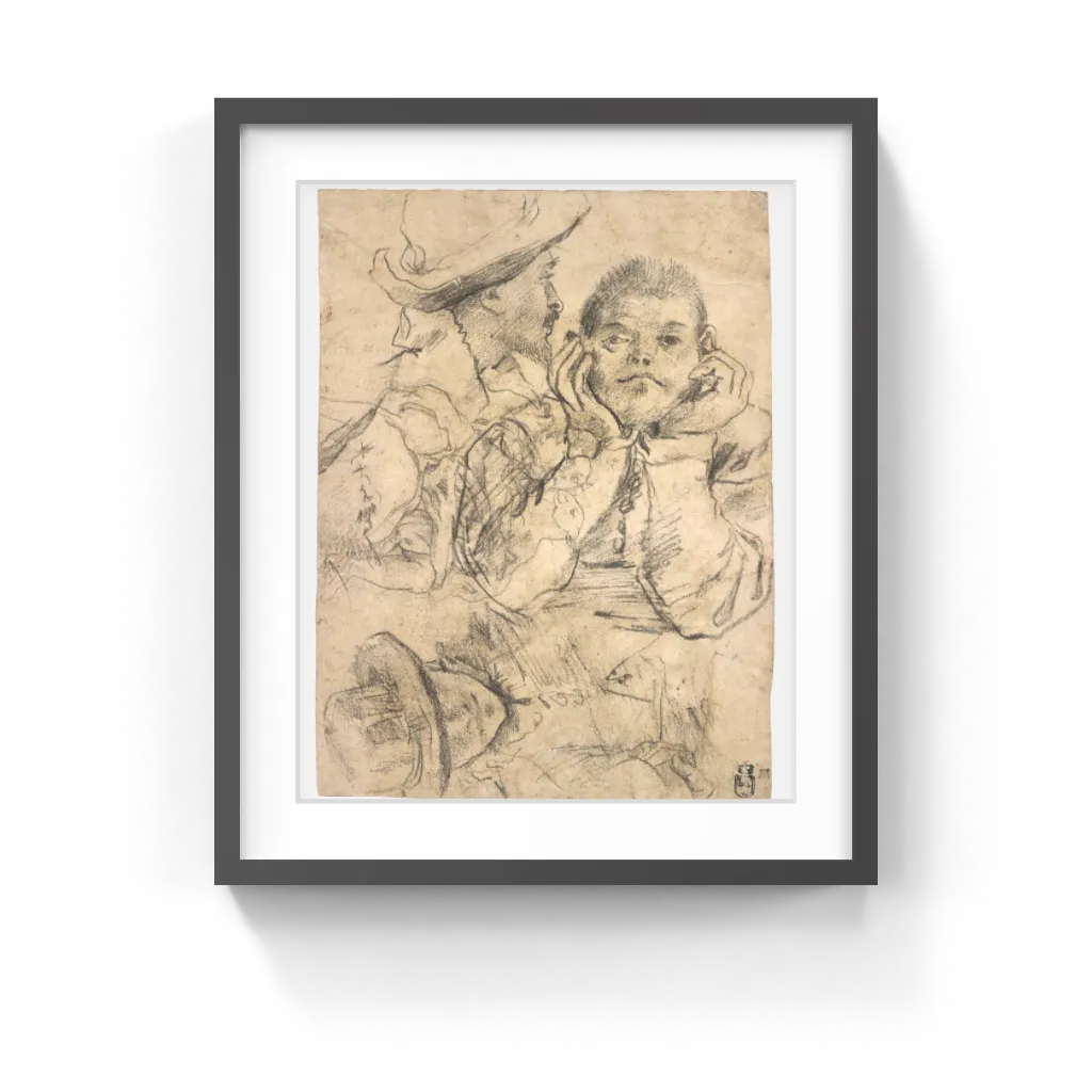 When the Getty Museum purchased this drawing in 1985, the conservator lifted the sheet from its mount and discovered additional studies on the verso: at the bottom another man with a hat (possibly the same man as on the recto), at the top an upside-down young boy resting on his arms, and at the right an unfinished red chalk study of a head sideways.