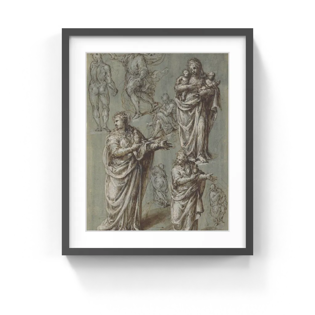 Aurelio Luini (Italian, about 1530–1593) A complex arrangement of biblical and mythological figures fills this well-preserved sheet. In the lower right corner, Aurelio Luini quickly sketched the figure of an apostle, which he later used in a fresco. Near the bottom of the page stand two larger figures of Mary Magdalene, each holding a jar of ointment with which to anoint the feet of Jesus Christ. Above, on the right, a woman--possibly the figure of Charity--holds a child in either arm. Scholars are unable to identify the other figures. The number in the top left of the sheet suggests that it once formed part of Luini's sketchbook.