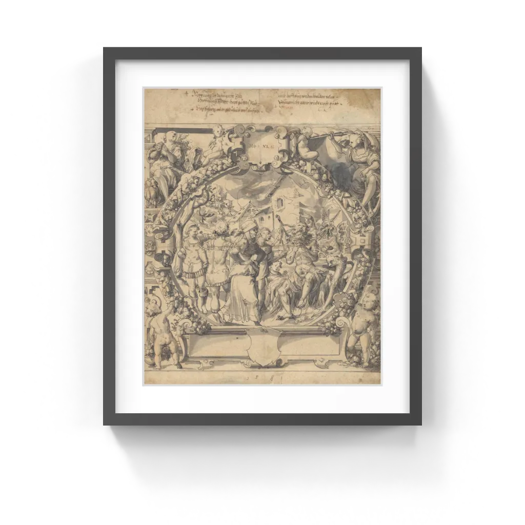 Werner Kuebler the Elder made this study for a stained-glass window, filling not only the circular central scene but also the surrounding frame with moralizing details. The figures of Patience, with a lamb, and Hope, with an anchor, perch on either side, references to the noble qualities that Job possessed. Lush bunches of fruit and vegetables ornament the design.