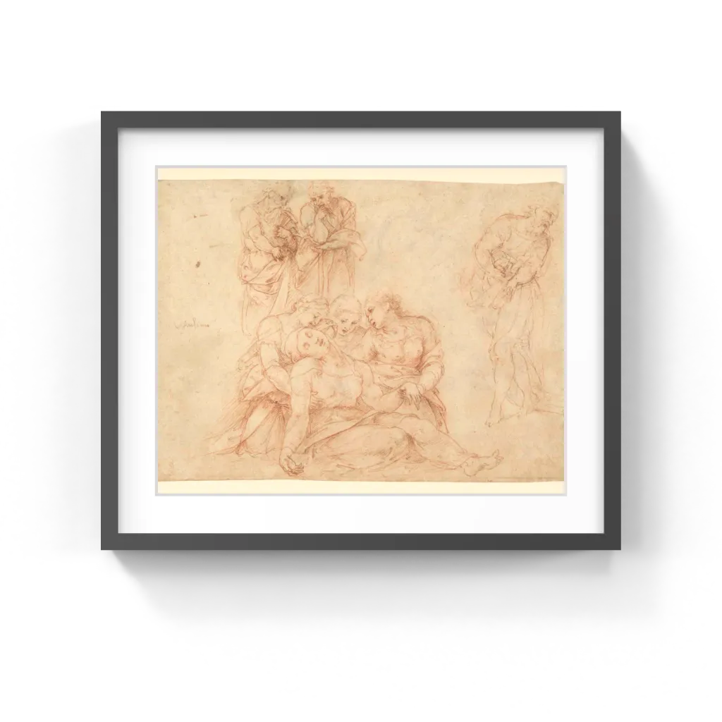 This sheet once may have been part of a sketchbook, now-dismembered in the Pierpont Morgan Library. The Morgan sketchbook pages are the same size as this sheet, and they show similar figures and groups inspired by Leonardo and Raphael, drawn with the same graceful style.