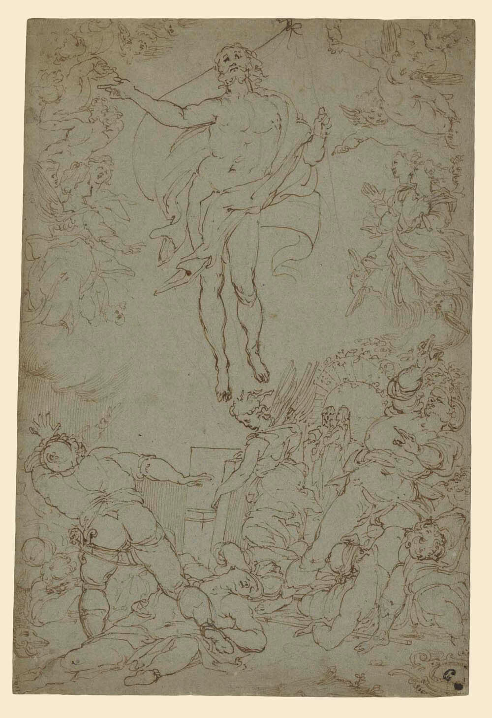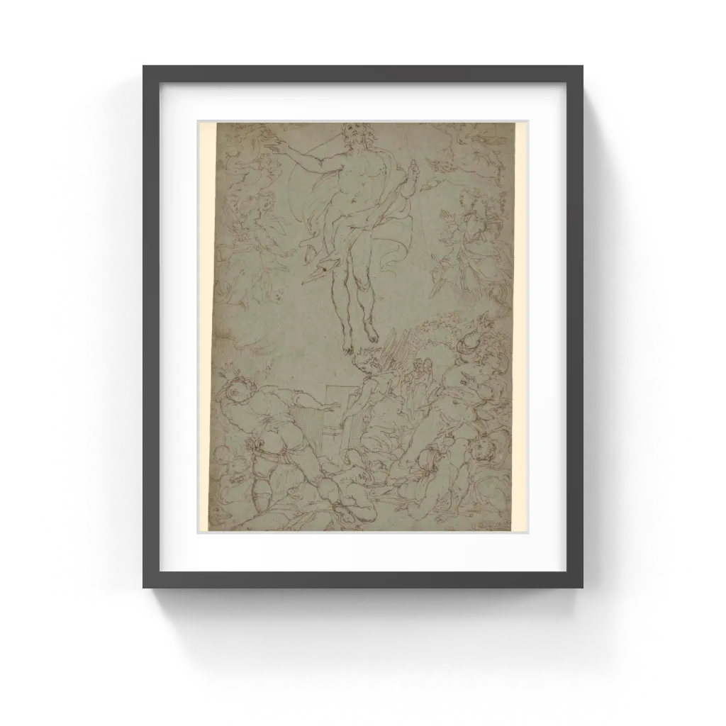 Santi di Tito (Italian, 1536–1603) Numerous gesticulating figures surround the resurrected body of Christ as he floats in the sky, his eyes raised to heaven and a large banner in his hands. At the center rear, an angel has opened the door of the tomb, while the soldiers who were meant to guard it recline or reach fruitlessly towards Christ, who is surrounded by rejoicing angels. Under an arched gate in the rear stand the small figures of two holy women.