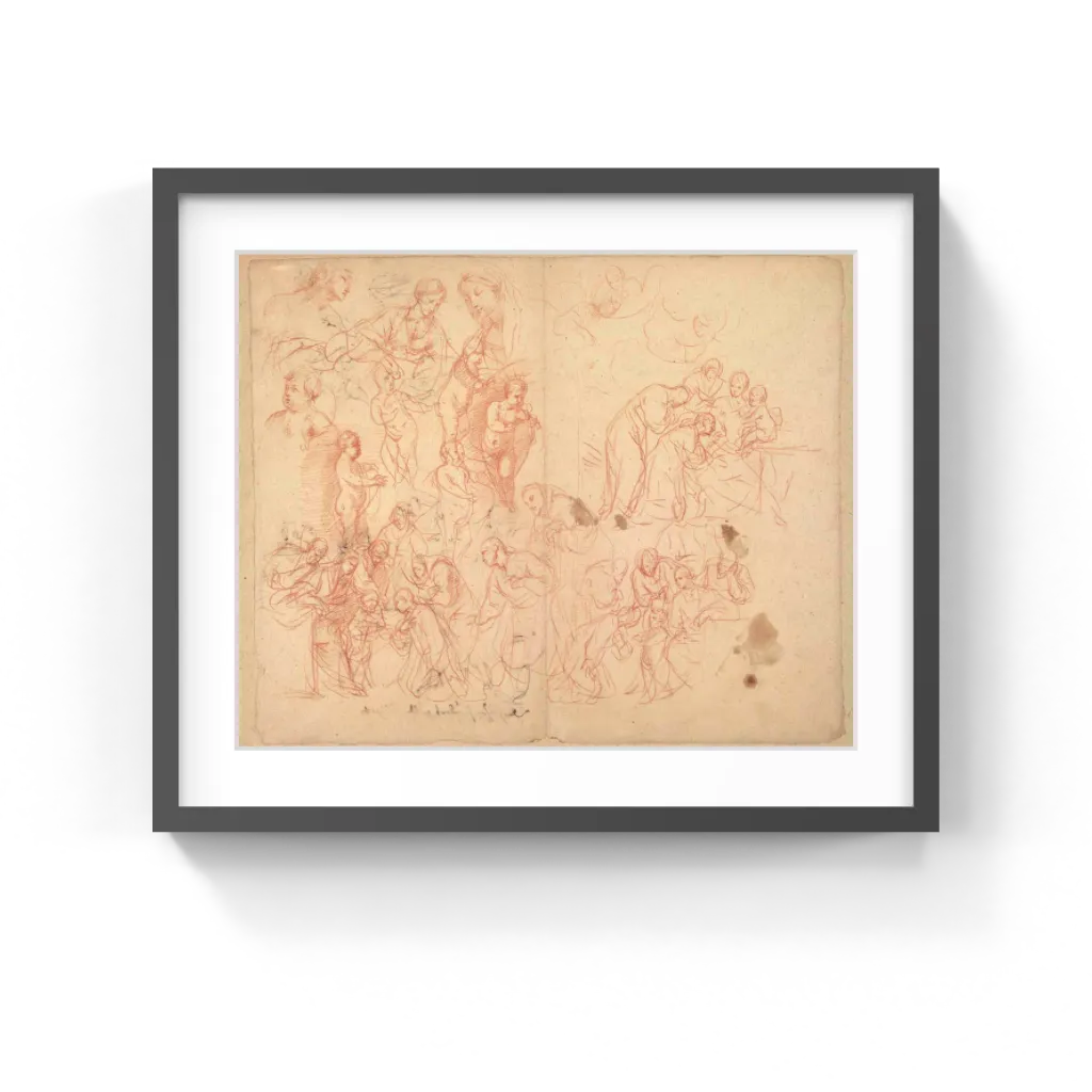 Karel Skréta (Bohemian, 1610–1674) As he worked out compositional arrangements and poses of figures, Karel Skréta filled this sheet with studies of the Virgin and Child adored by saints. On the recto, figures pour across the page almost cinematically, their flowing rhythm lending the entire sheet the feeling of being a single idea. Two compositional studies on the verso display Skréta's sensitivity to the ability of a few well-chosen lines to describe everything. At the left, his economical, delicate lines suggest drapery, relationships, and form. On the right, he made further