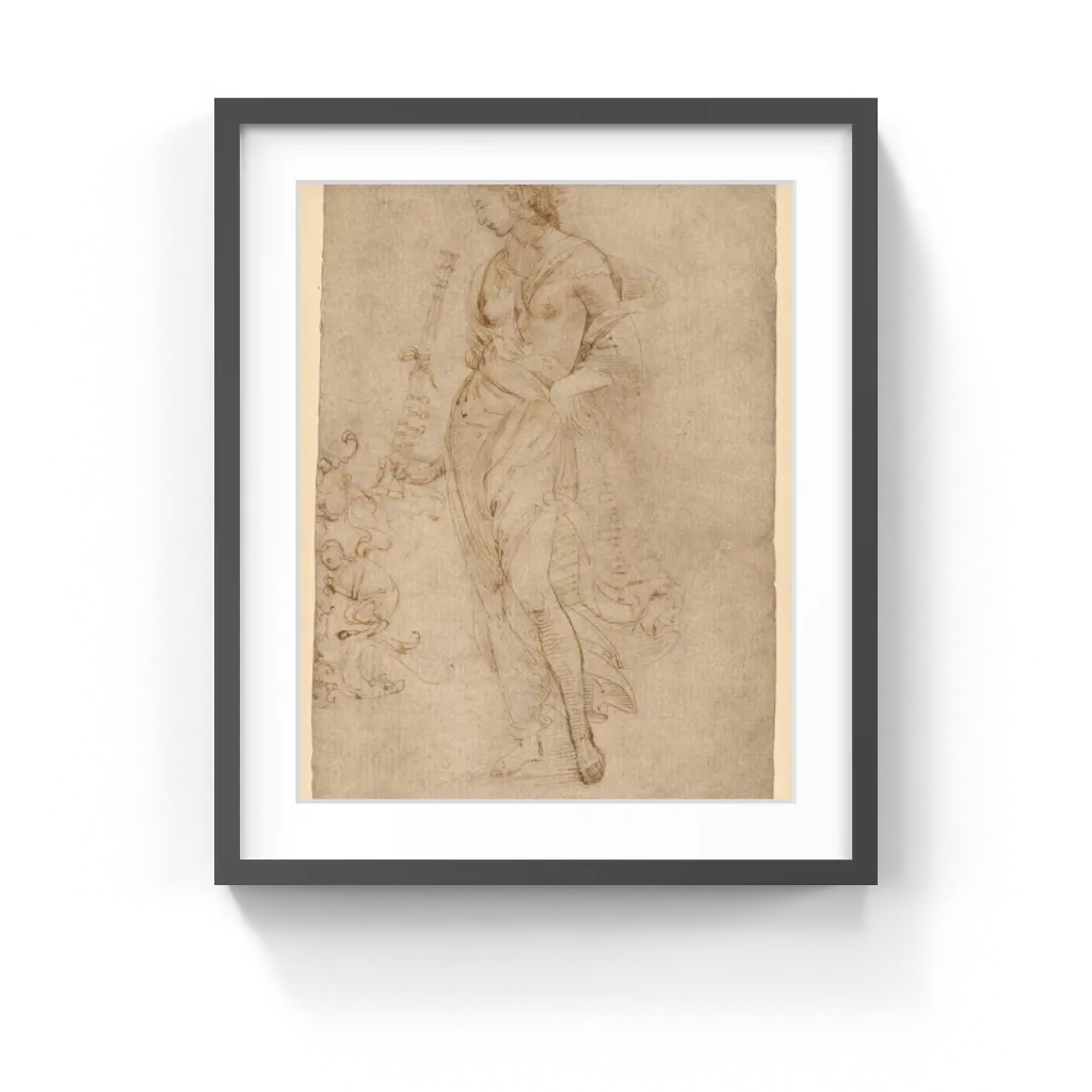 tibia, a reed pipe that was the principal wind instrument of most ancient peoples. In her relaxed contrapposto pose, this figure reflects the new interest in classical antiquity that marked Renaissance art. Scholars have attributed the drawing to the young Raphael Sanzio. His classicism exhibited calmness and grace as well as an interest in selective emphasis of details; here he subtly focused on the woman's chin and left leg. His work also revealed floating, melodic lines, such as the one that defines the woman's body from shoulder to foot.