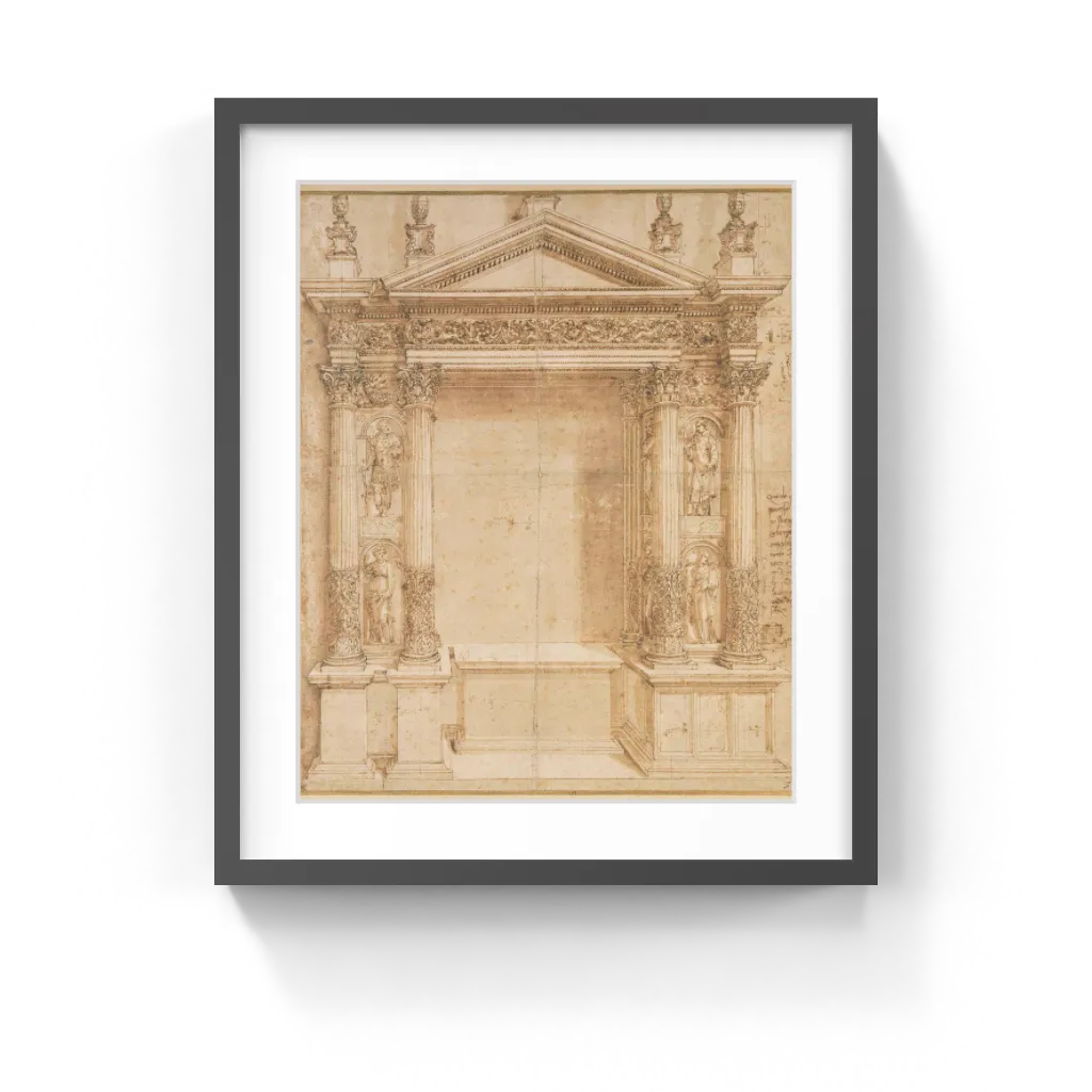 Baldassare Peruzzi (Italian, 1481–1536) Numerous details indicate that Baldassare Peruzzi made this design for an altar as a presentation drawing, to be shown to a patron for approval. He took great care when drawing the altar's intricate decoration, meticulously outlining the scrolling rinceaux pattern interlaced with animals along the frieze and base of the columns and carefully shading the delicate fluting, dentils, and egg-and-dart motifs. He also showed the effects of shadows on the top and right parts of the altar frame and noted the size of various components on the design so that this large altar could be built with precision.