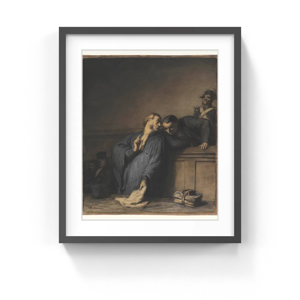Honoré Daumier (French, 1808–1879) An astute observer of human nature and an often biting satirist, Honoré Daumier here masterfully employed watercolor to illustrate the foibles of the French judicial system. Poverty forced Daumier to begin work at an early age; he once took a job as a messenger for the city's law courts, where he was exposed to the complexities and inequities of the legal system. The strong, dramatic diagonal of this composition focuses the viewer on the accused murderer. He leans over the dock to consult with his lawyer, who clearly controls the exchange, raising his right hand and seizing a sheaf of papers for reference. In contrast to the well-groomed and elegant lawyer, the criminal is wild-eyed and coarse. In the background a guard stands stiffly, oblivious to the exchange before him. In the gray courtroom, the empty space behind the guard suggests an air of anxiousness and uncertainty.