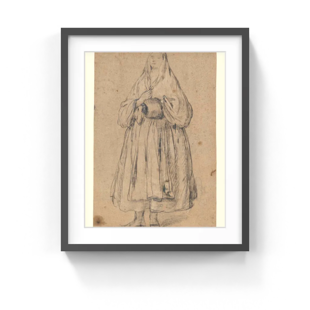 Pietro Longhi (Italian, 1701–1785) Turning slightly to the left with one hand tucked deep inside a muff, a woman stands holding the ends of her shawl with her other hand. This drawing and another of a similar subject originally formed a single sheet and have remained together since being divided, probably in the 1800s. Pietro Longhi drew both as preliminary studies for two female figures who stand beside each other in the center of a painting.