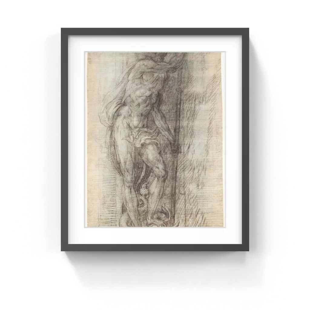 Giulio Campi (Italian, 1508–1573) Neptune, the Roman god of the sea, grasps his trident while resting one foot on the scaly head of a dolphin. He stands on a pedestal against a pilaster, the base of which is mainly defined by the dolphin's body. On each side are the hastily drawn lines of a vertical piece of architecture, while farther to the right are the dark shadows of his arms and trident.