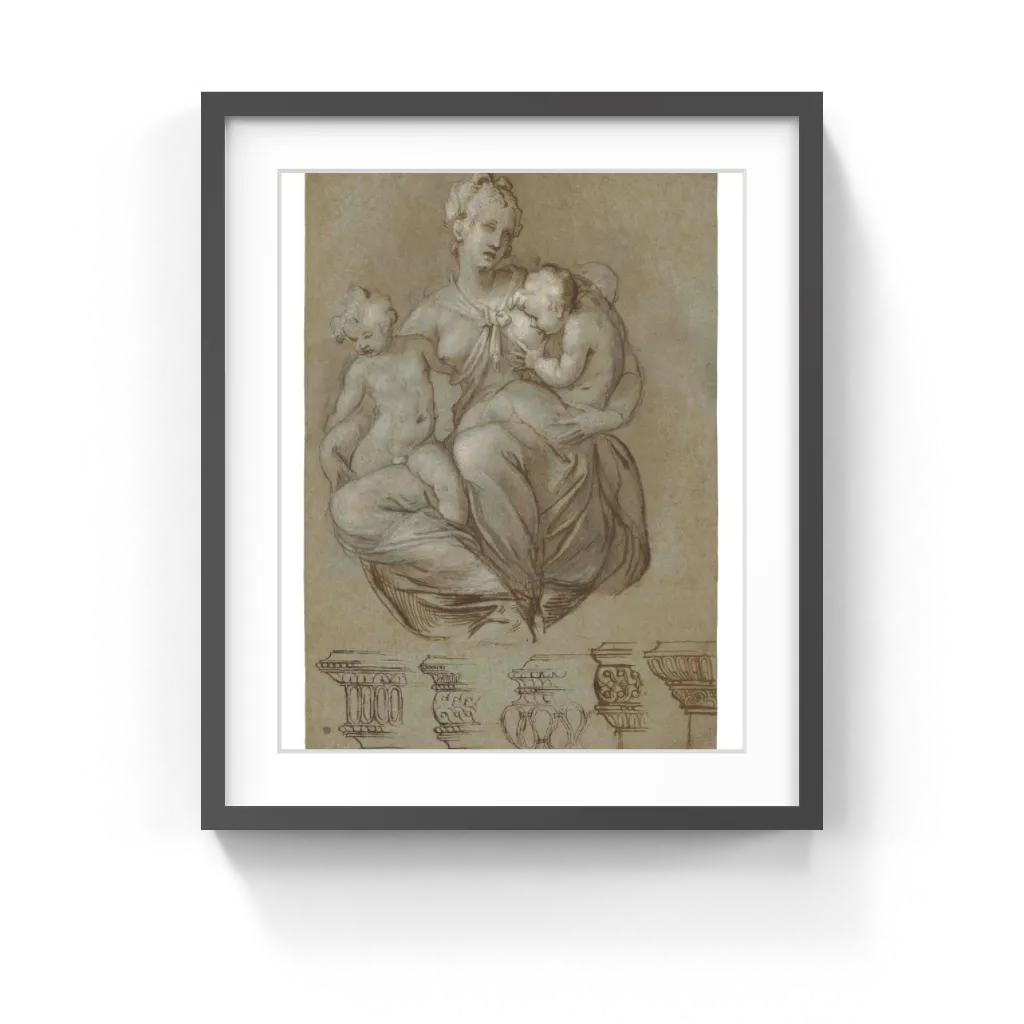 Paolo Farinati (Italian, 1524–1606) In the 1300s a woman suckling two children became the standard image of Charity, one of the three Virtues. Here the figure of Charity holds two putti on her lap. One suckles her breast, while the other twists around to look down at her knee. Paolo Farinati used delicate lines, areas of wash, and touches of white bodycolor to build each figure's form. Using brown ink, he outlined Charity and added dark, parallel lines of hatching to create shadows and highlights on her robe. As an afterthought, he made changes to the suckling putto's leg and added his right arm. He may have used the column capitals along the bottom and the frieze of putti on the verso as sources of motifs for the many decorative frescoes that he painted in local villas.