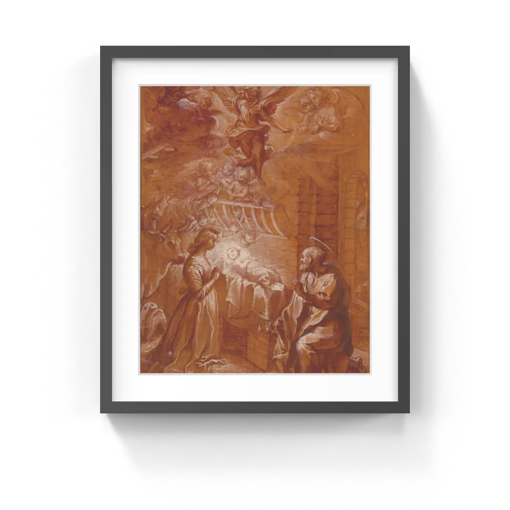 Francesco Vanni (Italian, 1563–1610) A heavenly light emanating from the Christ child in the manger casts a glow over the faces of both his parents, who crouch before him in the gloom. As the Virgin Mary kneels beside her son's bed, lines of white gouache highlight the folds in her dress, her forehead, nose, and chin. An ox and an ass lean over her shoulder to nibble at the hay in the manger, ignoring the baby in the basket. The figure of Saint Joseph also glows from the light cast from the left, while his back remains in the inky darkness. Above the stable numerous angels and cherubs hover, watching the events below. The angel Gabriel floats in the center of the drawing, while the others cluster around in the clouds and even peak through the crib. The elaborate technique, high degree of detail, and squaring all lead scholars to believe that Francesco Vanni made this work in preparation for a painting, although no known work corresponds to it.
