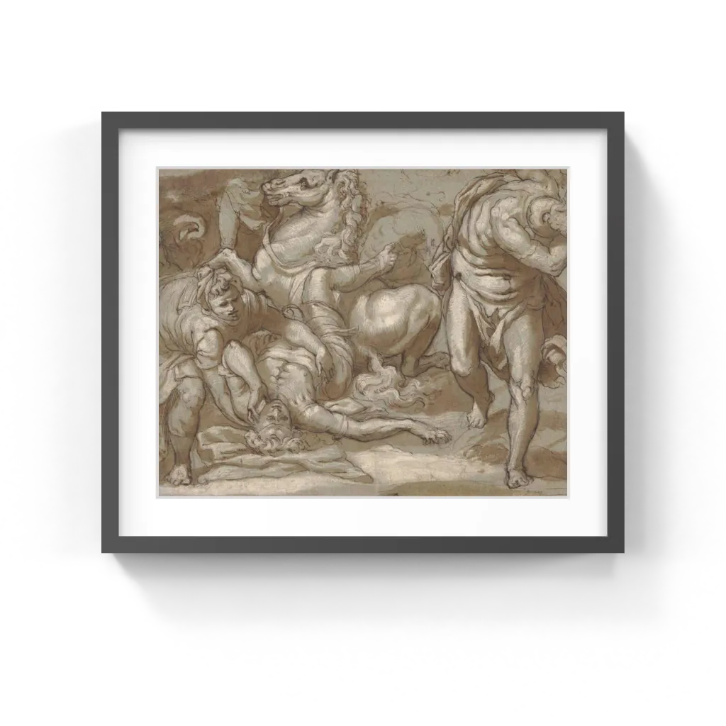 Taddeo Zuccaro (Italian, 1529–1566) Taddeo Zuccaro captured the dramatic moment when a sudden light from heaven blinded Saint Paul. The saint lies prostrate on the ground while one servant tends to him and another flees the scene in terror, shielding his eyes from the piercing light as he runs. His horse, too, has fallen down and clambers awkwardly to its feet. Paul had been on the road to Damascus to obtain authorization from the synagogue to arrest Christians when he was suddenly struck by the brilliant light and converted to Christianity. The artist sketched the figures first with black chalk, then went over their outline in brown ink. Fine strokes of lead white heightening create the textures of muscles and fabrics while providing a delicate contrast to the blue tone of the paper. Zuccaro drew this preparatory study for the lower section of a now much-damaged altarpiece in a chapel in Rome. He worked in the chapel from around 1557 until his death nine years later, painting frescoes from the life of Saint Paul.
