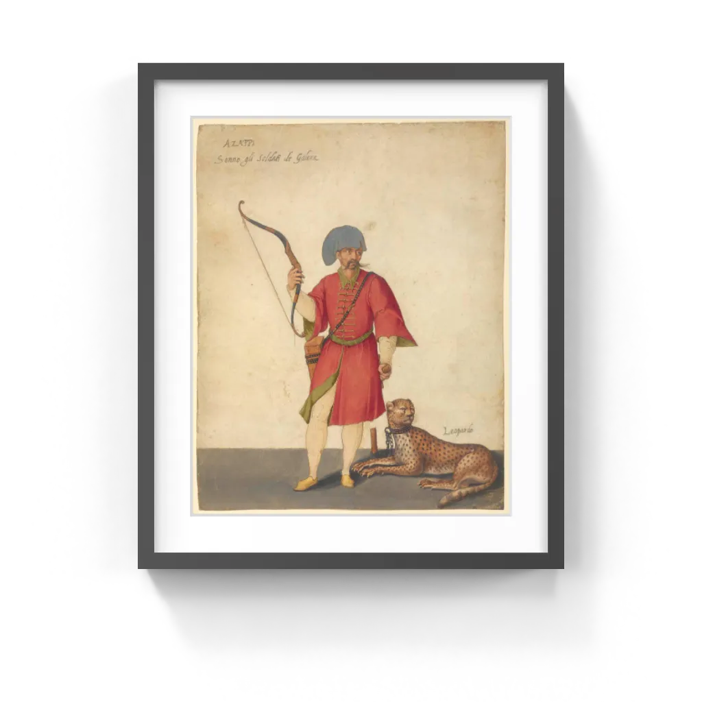 azappo, a seafaring Turkish archer, and a cheetah. Ligozzi probably painted this sheet as part of a book devoted to figures in Turkish costume, many of whom are accompanied by animals. Rather than drawing from life, he used a variety of costume engravings.