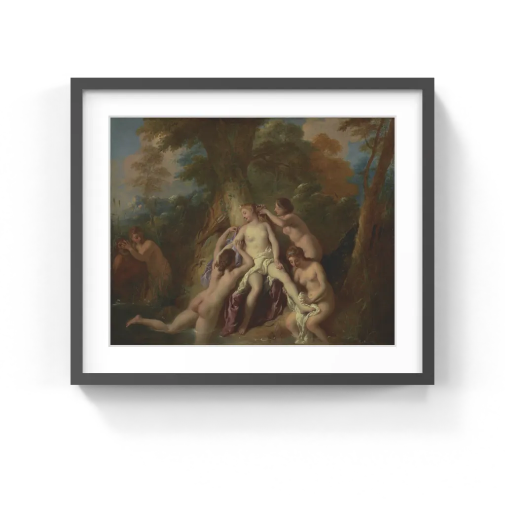 Jean-François de Troy (French, 1679–1752) In the Metamorphoses, the Roman poet Ovid described how nymphs bathed Diana, the goddess of the hunt, in a stream of clear water. Jean-François de Troy portrayed the moment after the bath when the nymphs are drying Diana's body and refastening her tunic. To the left, a nymph attempts to shield Diana's nudity from a lecherous river god's sight. De Troy's choice of subject matter and the description of the women's flesh--creamy white with a pink blush tint--give this painting an erotic charge. The river god, watching the scene voyeuristically from the side, becomes a stand-in for the viewer.