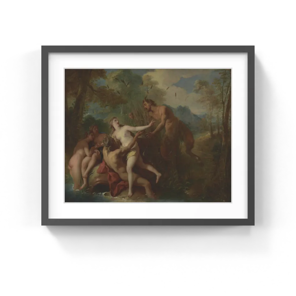 Jean-François de Troy (French, 1679–1752) As told by the Roman poet Ovid in the Metamorphoses, the lusty satyr Pan eagerly pursued the wood nymph Syrinx. Guarding her virtue, she ran until she reached a river and desperately begged her sisters of the stream to transform her. Just as Pan was about to embrace her, Syrinx changed into cattail reeds. When Pan discovered that he was holding nothing but marsh reeds, he sighed in disappointment, causing the wind to blow through the reeds. He was enchanted by the sound, believing it to be the mournful cry of his beloved Syrinx; from the reeds he fashioned a set of pipes so that he could have her with him always.