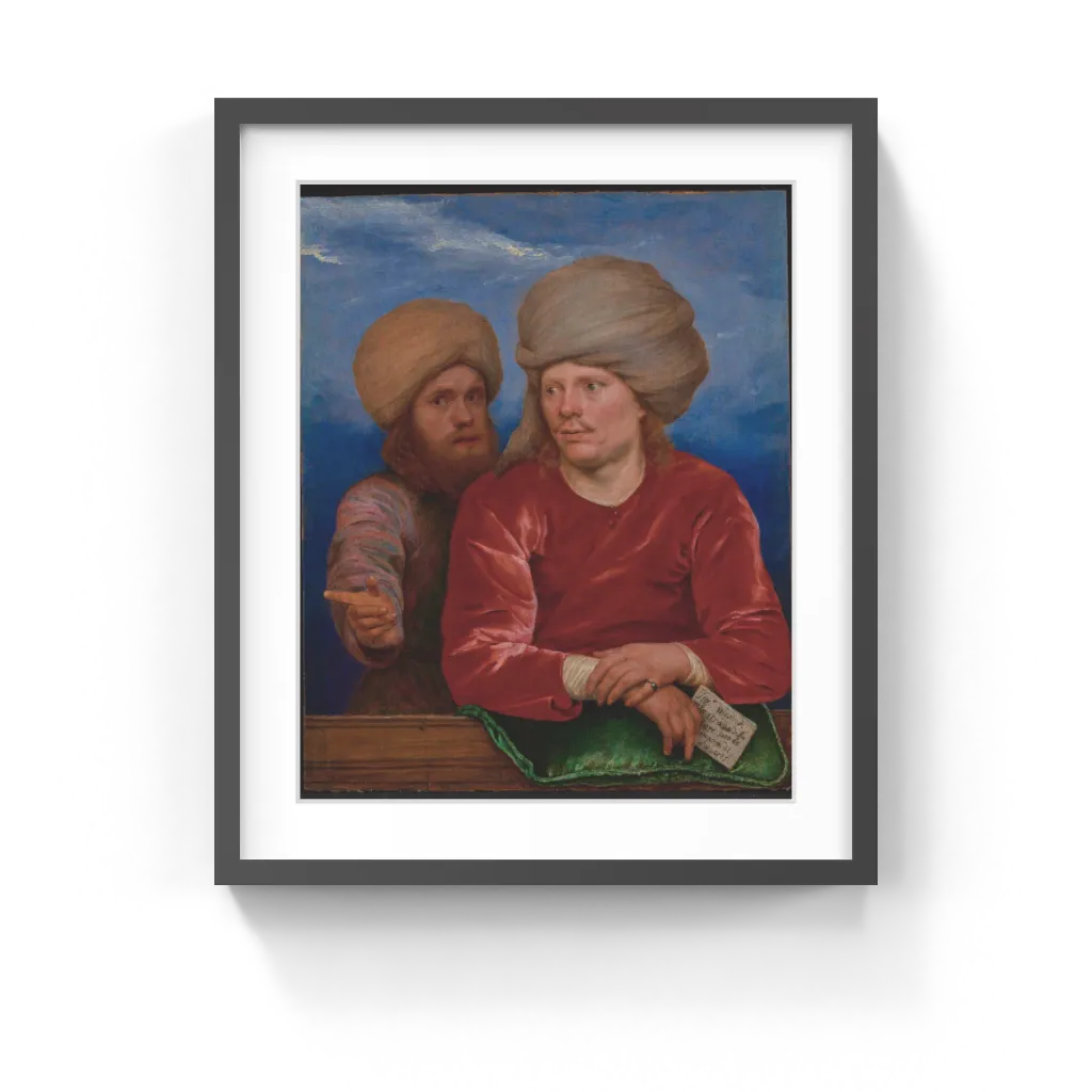 Michael Sweerts (Flemish, 1618–1664) Two European men in Middle Eastern dress pose in front of a parapet. The bearded man on the left gestures to the right, while the other man looks in the same direction and holds a cryptic message in Italian: Sig:r mio videte la strade di sa lute per la mano di sweerts (My Lord, see the way to salvation by the hand of Sweerts). The note's meaning and the identity of the two gentlemen have eluded scholars. The two men appear to be individualized portraits, recalling the tradition of friendship portraits so popular in Northern Europe. The refined execution of this painting is typical of Flemish artist Michael Sweert's late style, practiced when he traveled in India as a missionary. "My Lord," then, may be addressed to the viewer, encouraging him to listen to Sweerts's preaching. With this double portrait, the artist may be urging the observer to find redemption through his belief in God, just as Sweerts did.