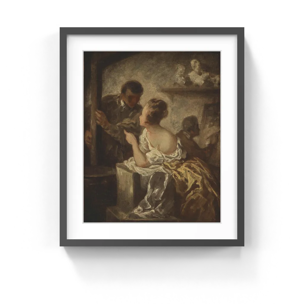 Struck by the expressive power of Fragonard's rapid brushstroke, Daumier paid homage to his predecessor in a series of paintings that included The Studio. Daumier, who almost never portrayed beautiful women as objects of attraction, succumbed to Fragonard's sensuality and endowed this model with the upswept hair and casual off-the-shoulder costume of Fragonard's females. Emulating Fragonard's manner of sketching on canvas, Daumier made her dress shimmer, drawing with his brush to build the lights cascading from her blouse onto her full skirt.