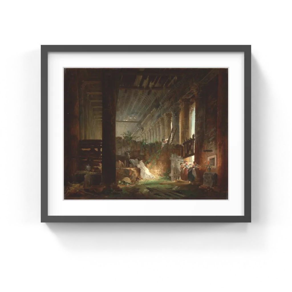 Placed on the stone altar are a crucifix, books, an open Bible, an hourglass, a skull, and a rosary. The skull and hourglass, common symbols of the temporality of man and his creations, suggest that the building itself represents fallen greatness. Hubert Robert emphasizes the ruins' immensity by contrasting the small figures with the structure's massive columns. In the left foreground, a column shrouded in darkness runs nearly the full height of the composition. Birds roosting in the upper reaches of the lofty barrel vault reinforce the impression of the monument's vast dimensions.