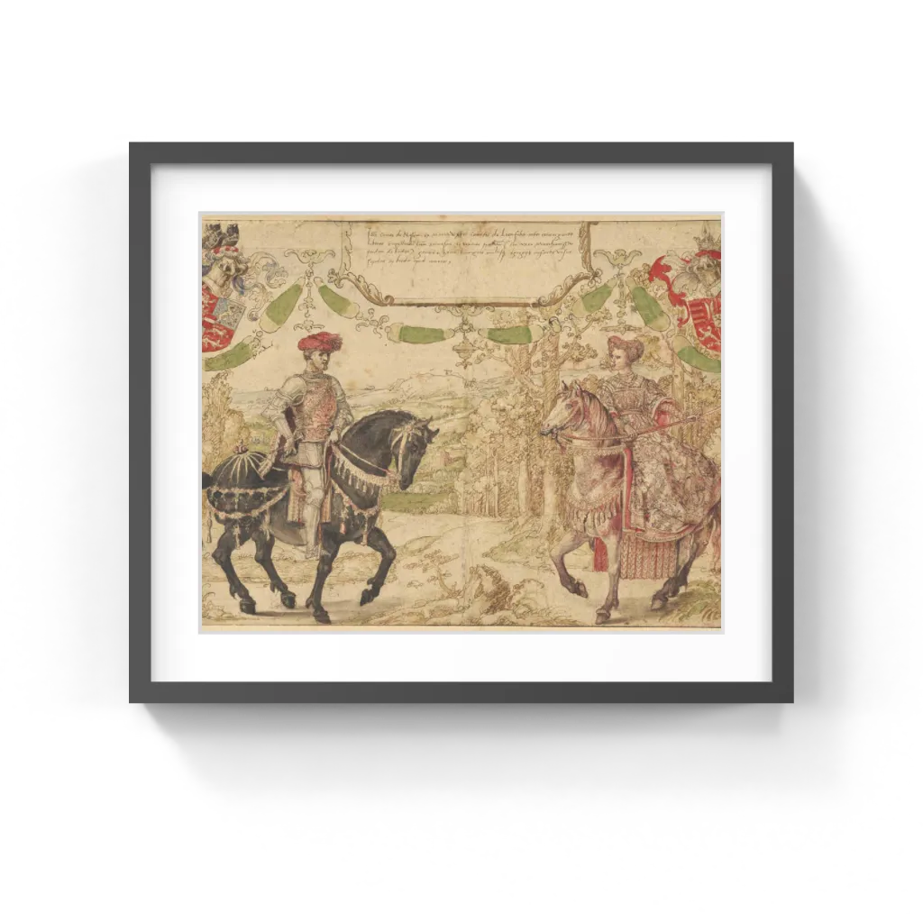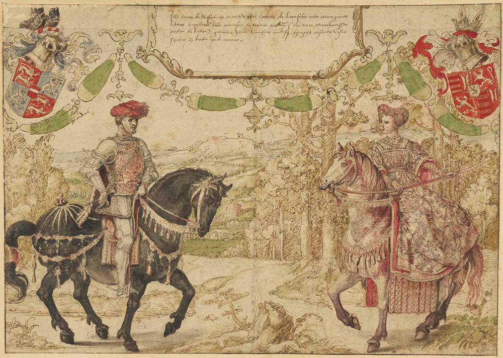 Bernaert van Orley (Netherlandish, about 1488–1541) Bernaert Van Orley, the preeminent Netherlandish tapestry designer of the early 1500s, conveyed the prestige and wealth of his subjects, Count Johan IV of Nassau and his wife, through a number of devices. They wear ornate costumes and their horses wear lavish festival trappings, evoking the pageantry of the late Middle Ages. The encyclopedic inscription in the cartouche at top, the swag, and the coats of arms immediately communicate this couple's elevated status, while the brilliant watercolor heightens the scene's grandeur. Perhaps in reference to the family's vast domains, Van Orley showed a wide expanse of land, including forests, farmlands, and mountains.