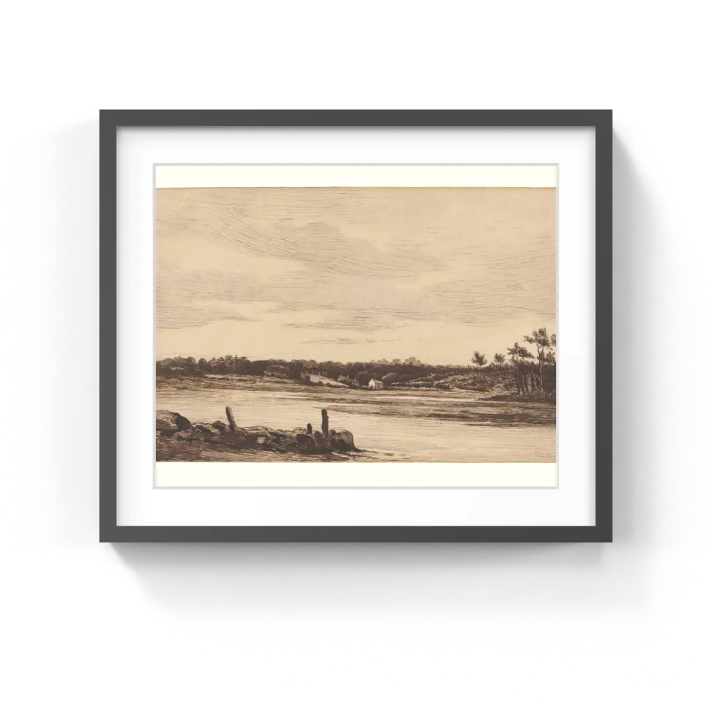 Théodore Rousseau (French, 1812–1867) The wide, smooth river Loing, a branch of the Seine, wraps around the Forest of Fontainebleau, located fifty miles south of Paris. In this drawing Théodore Rousseau focused on the large expanse of sky that seems to compress the land into a flat, dark band beneath it. Only a few trees and rocky outcrops project upwards, breaking the winding lines of the river and sandy banks.