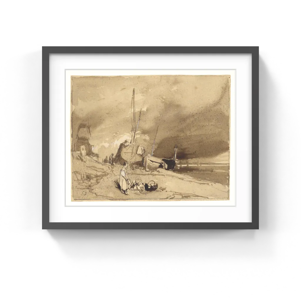 Eugène Isabey (French, 1803–1886) Standing alone on the empty beach with her baskets, a despondent fisherwoman gazes out at the approaching storm. Two fishing boats tilt sideways on the sand behind her, marooned on the beach by the receding tide. A windmill sits high on the edge of the sands on the left of the scene. But Eugène Isabey made the dark, threatening sky the drawing's focus, concentrating on the murky black clouds that cover the leaden sea.