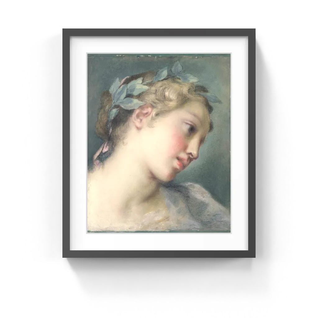 Rosalba Carriera (Italian, 1673–1757) This alluring muse gracefully turns her head to the left, exposing a seductive neck and tender pink earlobe. Transparent gauze covers her shoulders. Rosalba Carriera rendered the porcelain skin, flushed cheeks, and wavy hair with subtly blended pastel colors, creating a soft, velvety surface. The intense contrast between the ivory flesh and dark background imbues the divine creature with radiance. This delicate head crowned by soft curls and an ivy wreath was one of many idealized images Carriera made called