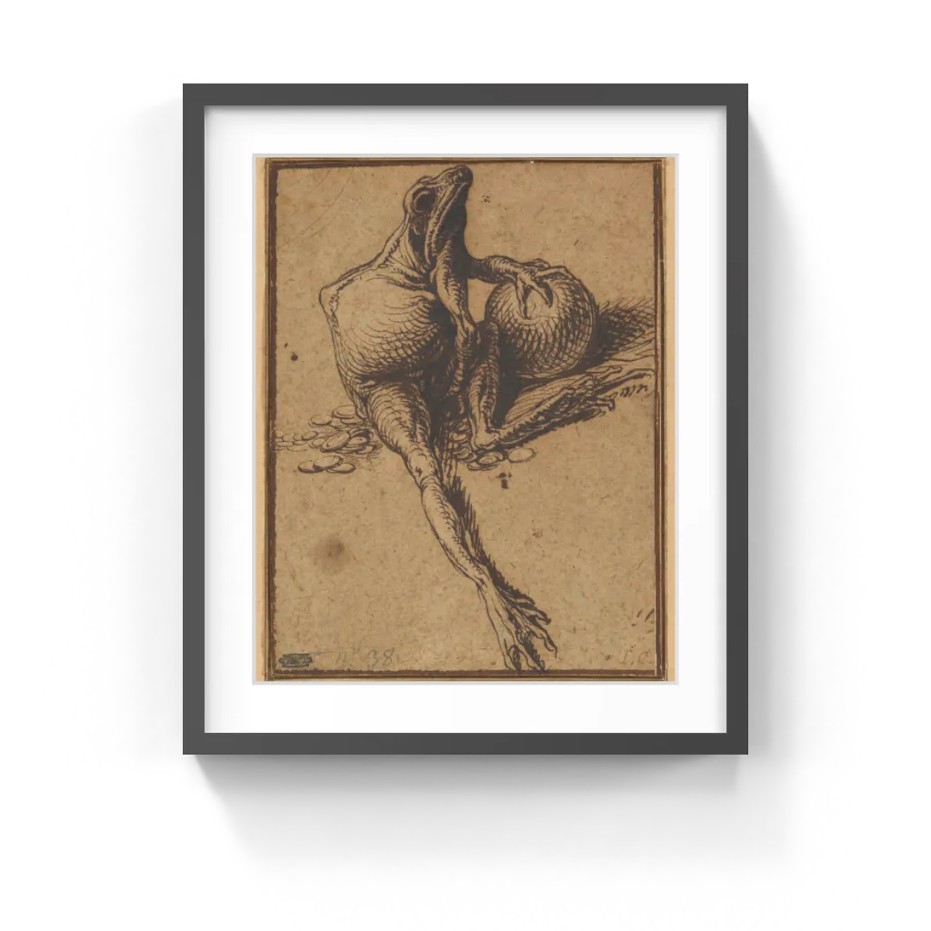 Jacques de Gheyn II (Dutch, 1565–1629) At first glance, this drawing of a frog appears to be a closely observed study of the natural world. Jacques de Gheyn II meticulously recorded the amphibian's long hind legs and loose skin. But on closer inspection the frog was clearly imbued with human characteristics. Its webbed feet were transformed into claw-like hands and the exaggerated hump on its back evokes a grotesque old man. With its raised head and prominent eye, the frog even appears to hold an impassive, almost haughty expression. De Gheyn pushed the boundaries of the natural world further: the frog sits atop a pile of coins and with its left "hand" grasps a sphere about the same size as its twisted trunk.